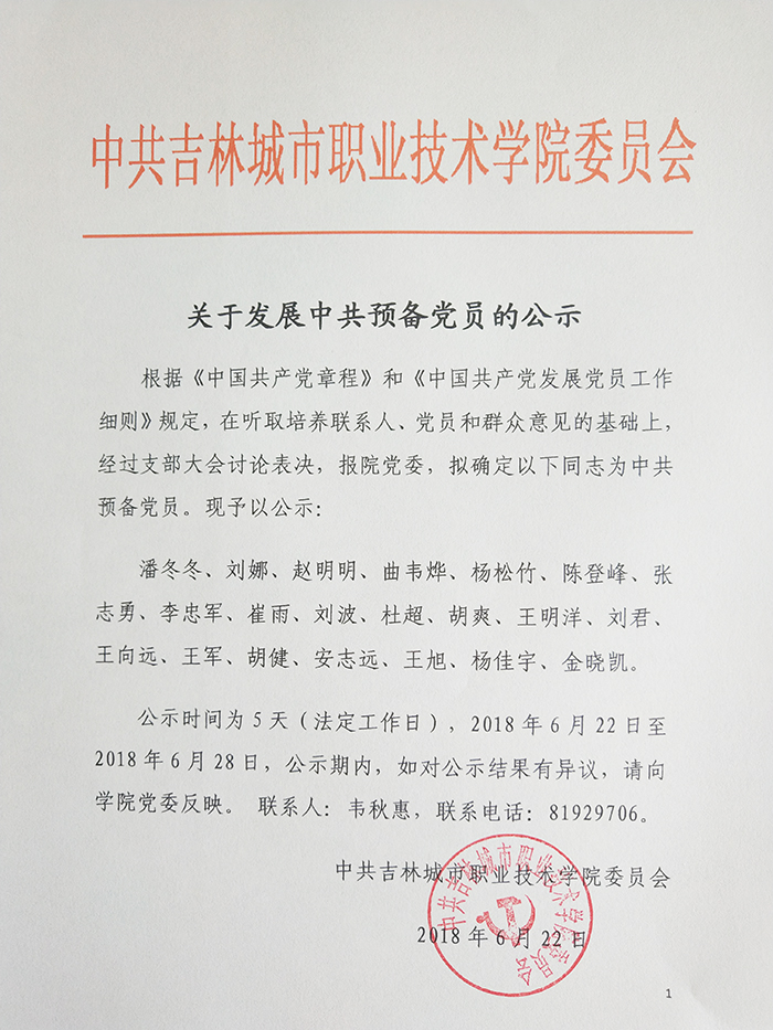 中共吉林城市职业技术学院委员会|关于发展中共预备党员的公示