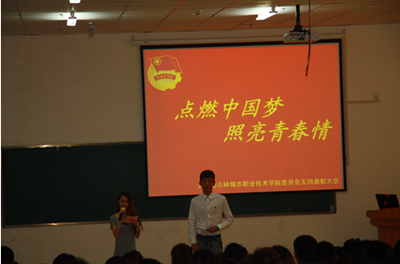2014年5月22日下午,中共吉林城市职业技术学院团委在1号楼6楼609教室举行“点燃中国梦,照亮青春情”五·四表彰大会。院长高树德教授、副院长孙松林教授、学生处张凯处长、伍秀云副处长、团委王志刚书记、受表彰学生代表及部分学生干部参加会议。