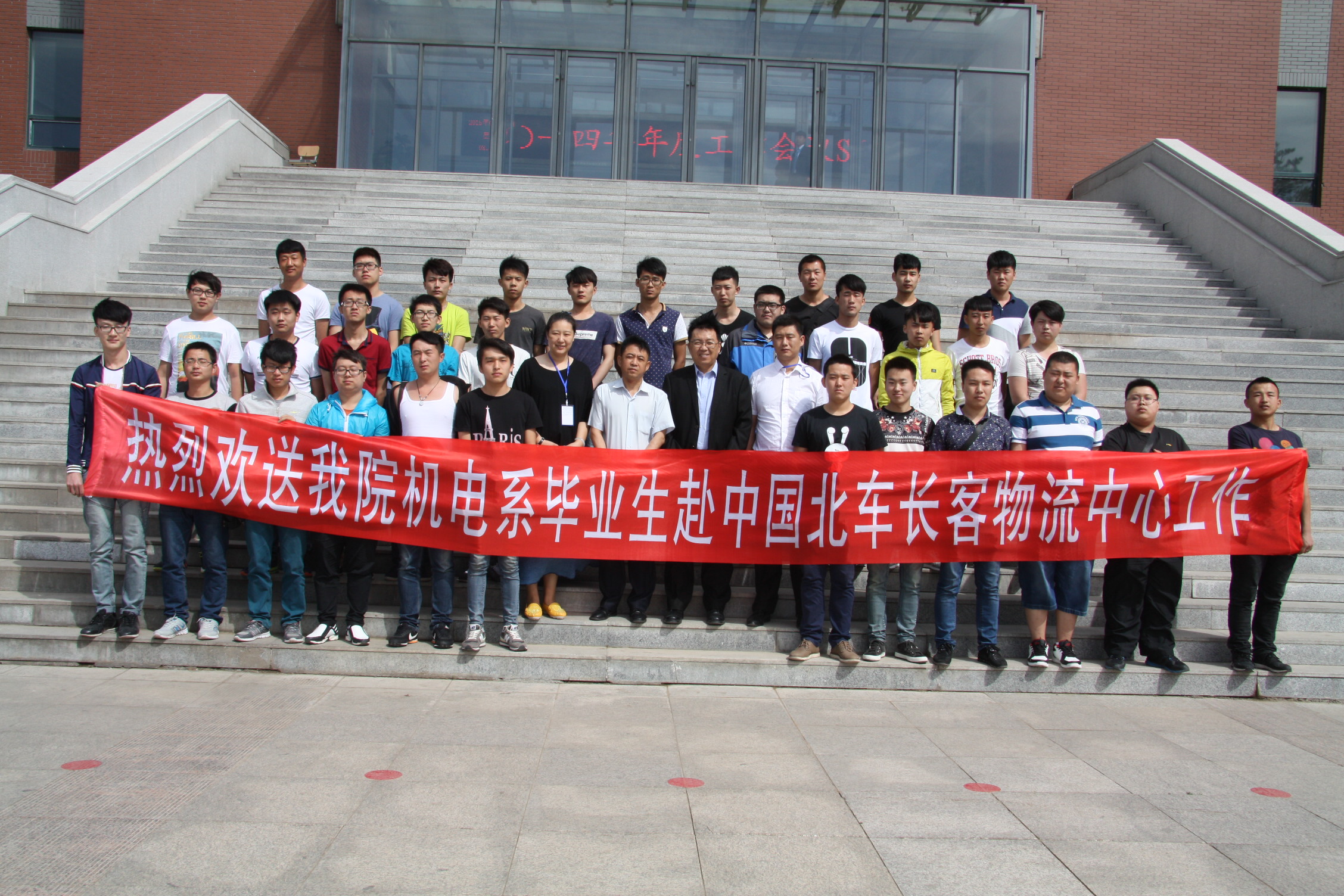图为我院院领导及辅导员与机电工程系13届赴中国北车长客物流中心工作的毕业生在行政楼合照留念