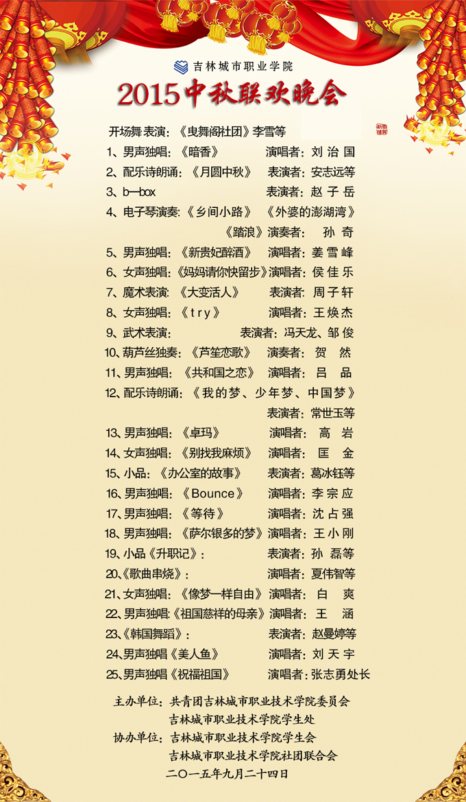 每年八月十五,是中国传统的中秋佳节。对吉林城市学院的大一新生来说,今年是他们中大部分人第一次离家在外过中秋。为了让大一新生感受到城市学院大家庭的温暖,让他们度过一个难忘的中秋佳节。2015年9月24日晚上18:30分,我院在学院中心广场隆重举办了中秋迎新晚会。吉林省政协常委、SJ国际教育集团孙进董事长、杨以刚院长、皇鸣副院长、院党委宋继红副书记,学院各系部主任等前来观看。晚会开始前,吉林省政协常委、SJ国际教育集团孙进董事长作了重要讲话。