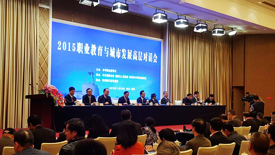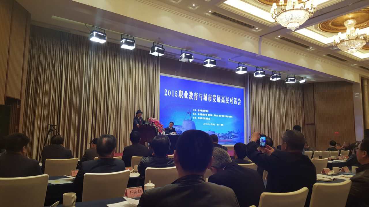 11月25日“2015职业教育与城市发展高层对话会”在四川省德阳市旌湖国际酒店隆重召开。本次会议由中华职业教育社主办,中共德阳市委市政府、四川省中华职业教育社承办,四川现代教育集团协办。全国人大常委会副委员长、中华职业教育社理事长陈昌智等重要领导出席了本次会议,国内知名专家学者专题报告了职业教育与城市发展互动关系的最新研究成果,并与德阳市政府及其各相关部门负责人以及普通会议代表开展互动对话。