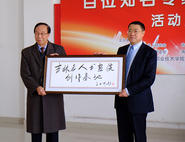 原吉林大学管理学院院长,吉林省名人研究会会长,吉林城市学院专家委员会名誉主任靖继鹏先生为吉林城市职业技术学院颁发由王云坤先生题写的“吉林名人书画院”创作基地牌匾。