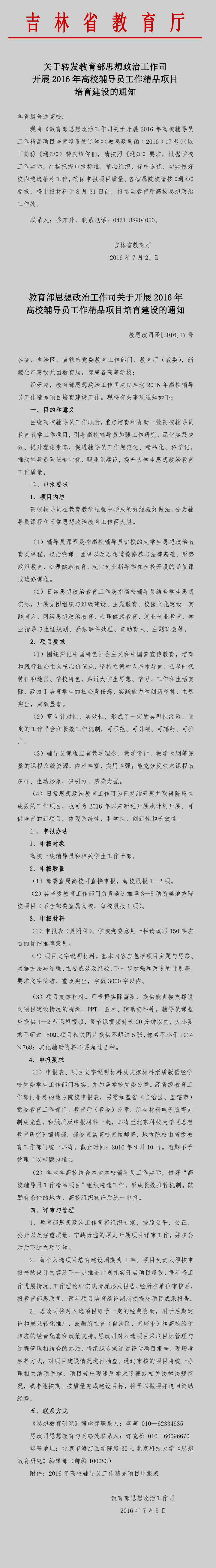 关于转发教育部思想政治工作司开展2016年高校辅导员工作精品项目培育建设的通知